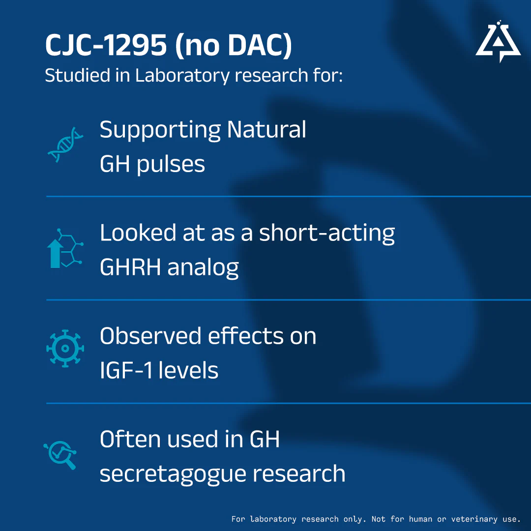 CJC-1295 No DAC is a truncated peptide analogue of growth hormone releasing hormone (GHRH). First developed in the 1980s, research studies with modGRF have shown it to improve muscle repair and growth, accelerate wound healing, strengthen bones, increase fat burning, and improve metabolism. It may also have beneficial effects on blood sugar regulation and the immune system.