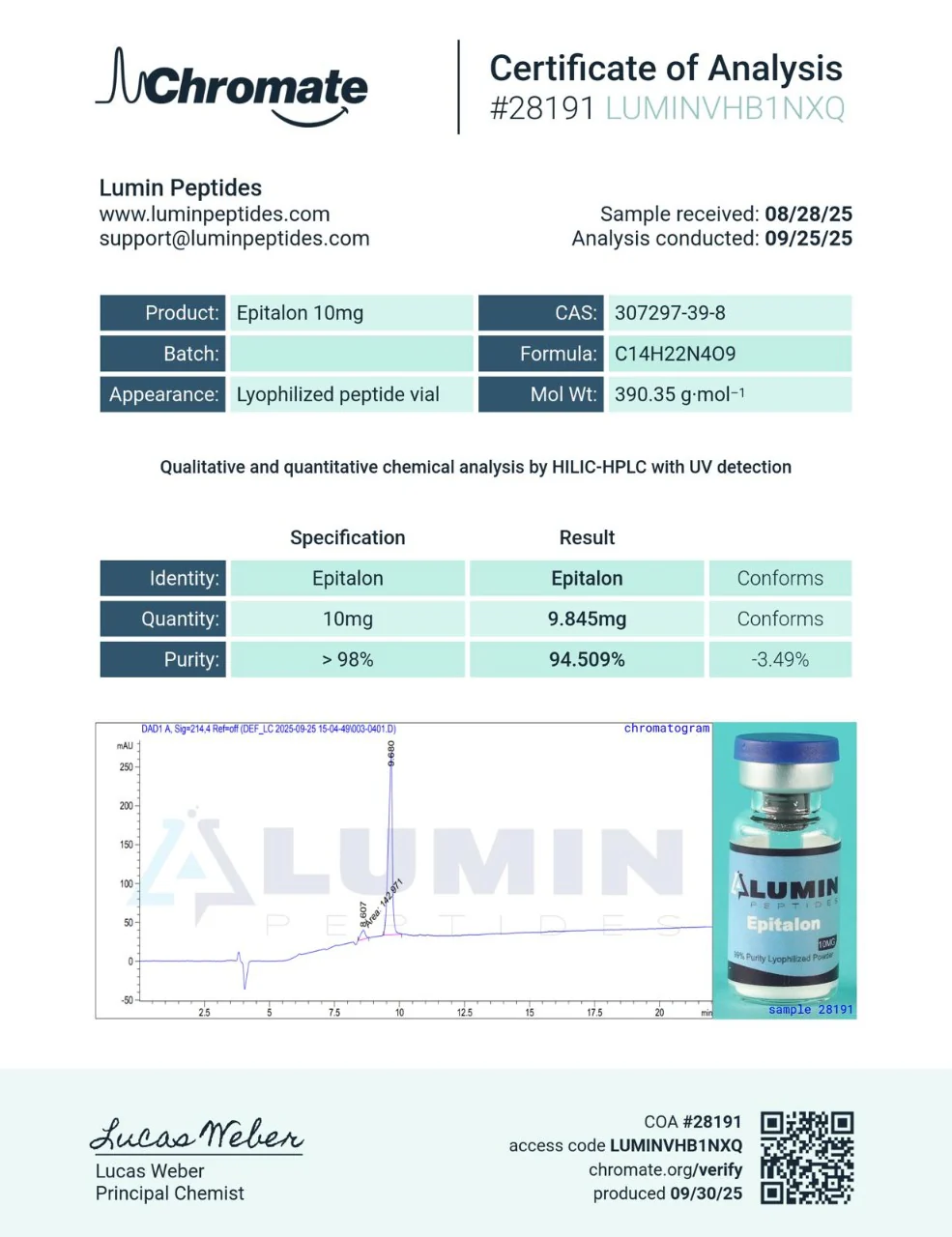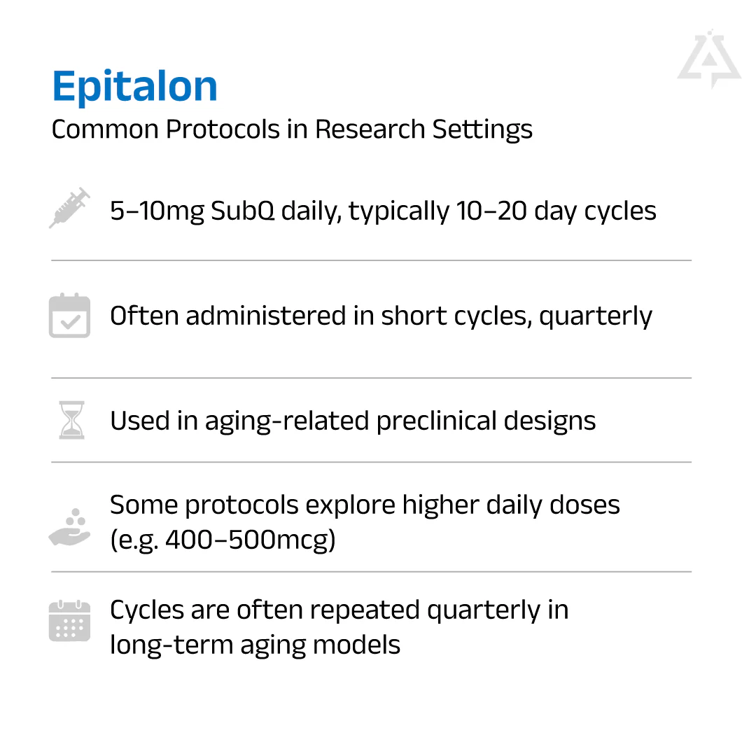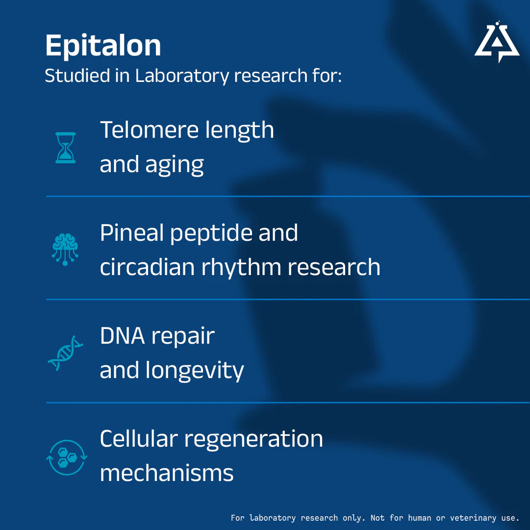 Epitalon is a synthetic derivative of Epithalamin and a potential modulator of telomerase, the enzyme that maintains and protects the telomere caps at the ends of chromosomes (strands of DNA). Research suggests that Epithalon induces telomere elongation and may fight off the effects of aging as a result.