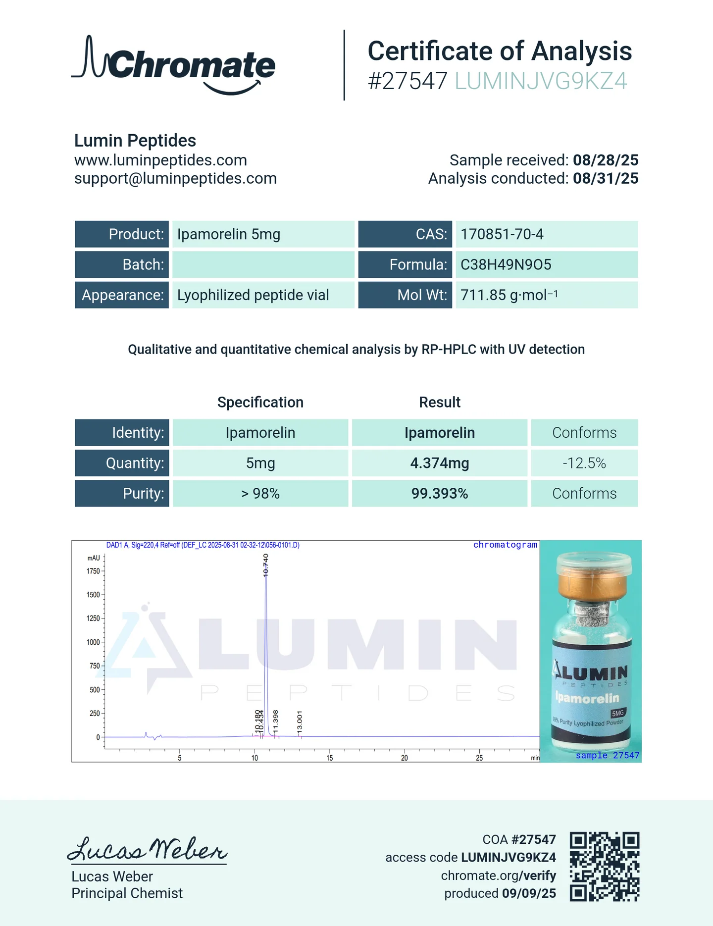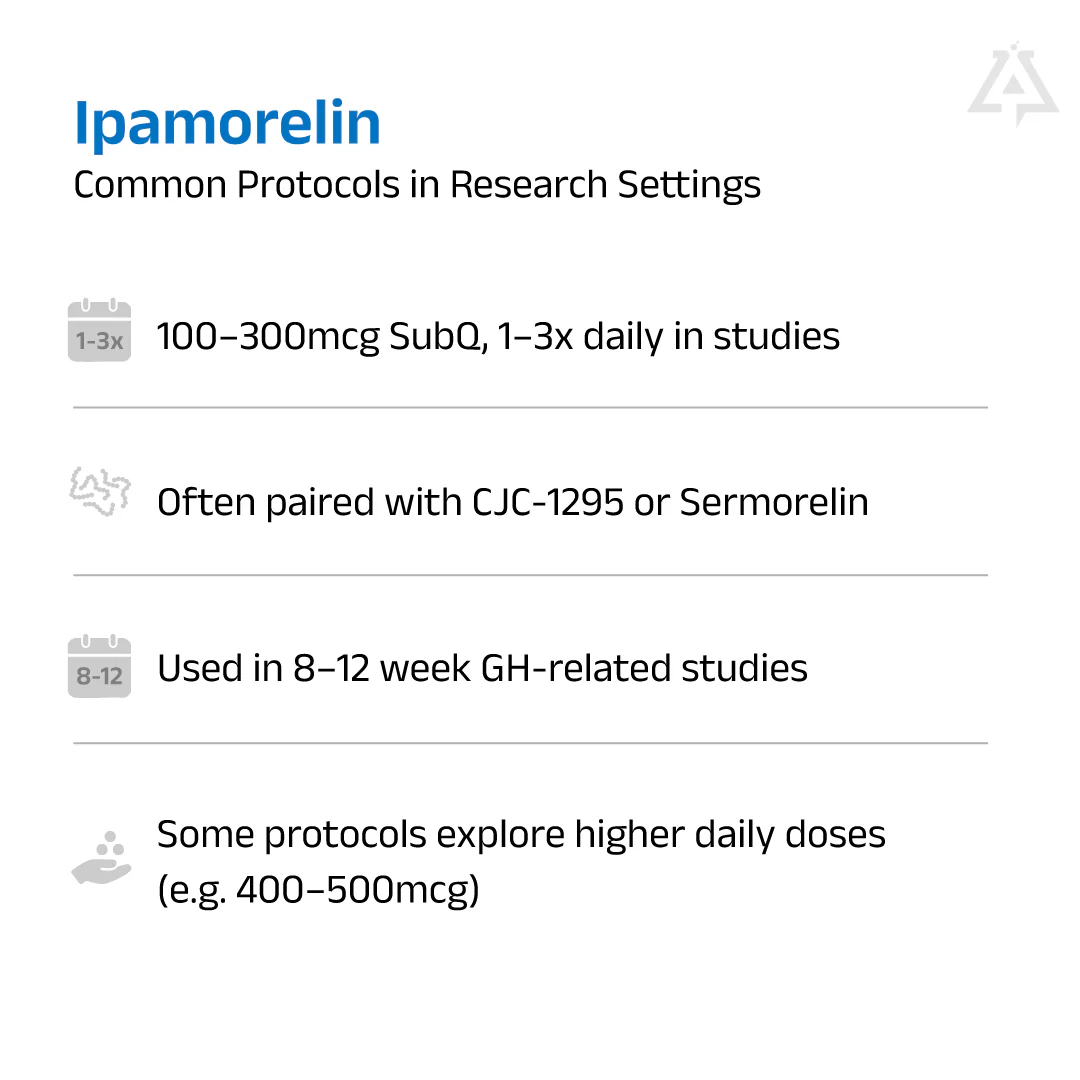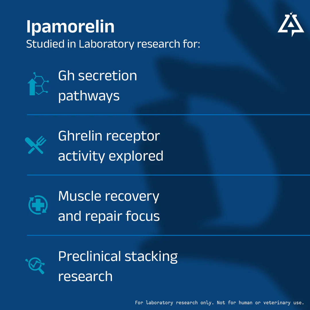 Ipamorelin is a short peptide sequence capable of binding to the ghrelin/growth hormone secretagogue receptor. It is one of the most selective growth hormone (GH) secretagogues known and has been shown in laboratory studies to have no effect on ACTH, prolactin, follicle-stimulating hormone, luteinizing hormone, thyroid-stimulating hormone, or cortisol release [1]. Given its high level of specificity, ipamorelin has been of interest in research both as a therapeutic in and of itself as well as a model peptide for understanding how selectivity in GH receptor binding is achieved. Its presence plays a key role in the overall growth and repair of musculoskeletal tissue.