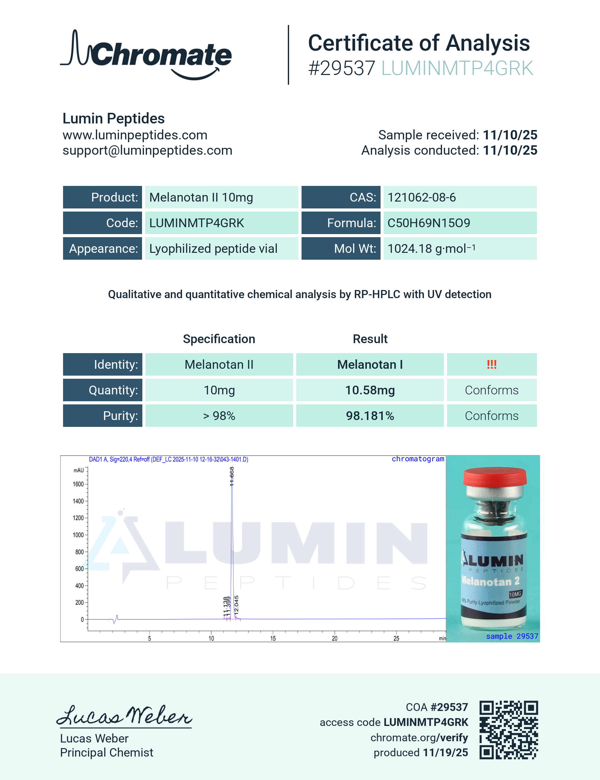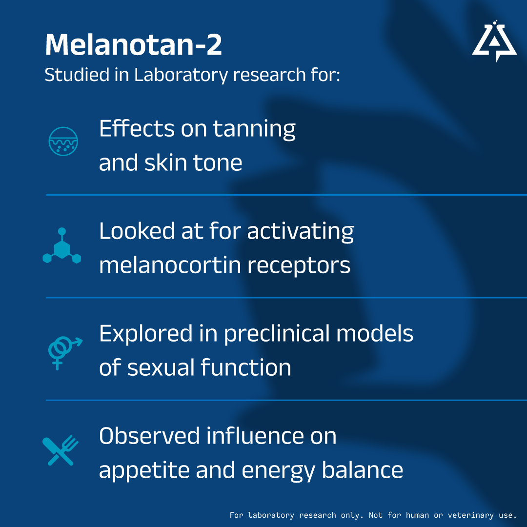 Melanotan-2 is a synthetic analogue of alpha-melanocyte-stimulating hormone. Developed in the 1980s, Melanotan-2 has been shown to increase sexual arousal, reduce compulsive/addictive behavior, curb hunger and increase melanin production. Research has shown the peptide to stimulate melanocytes therefore producing increased skin pigmentation and may help to combat autism when used during early childhood development.