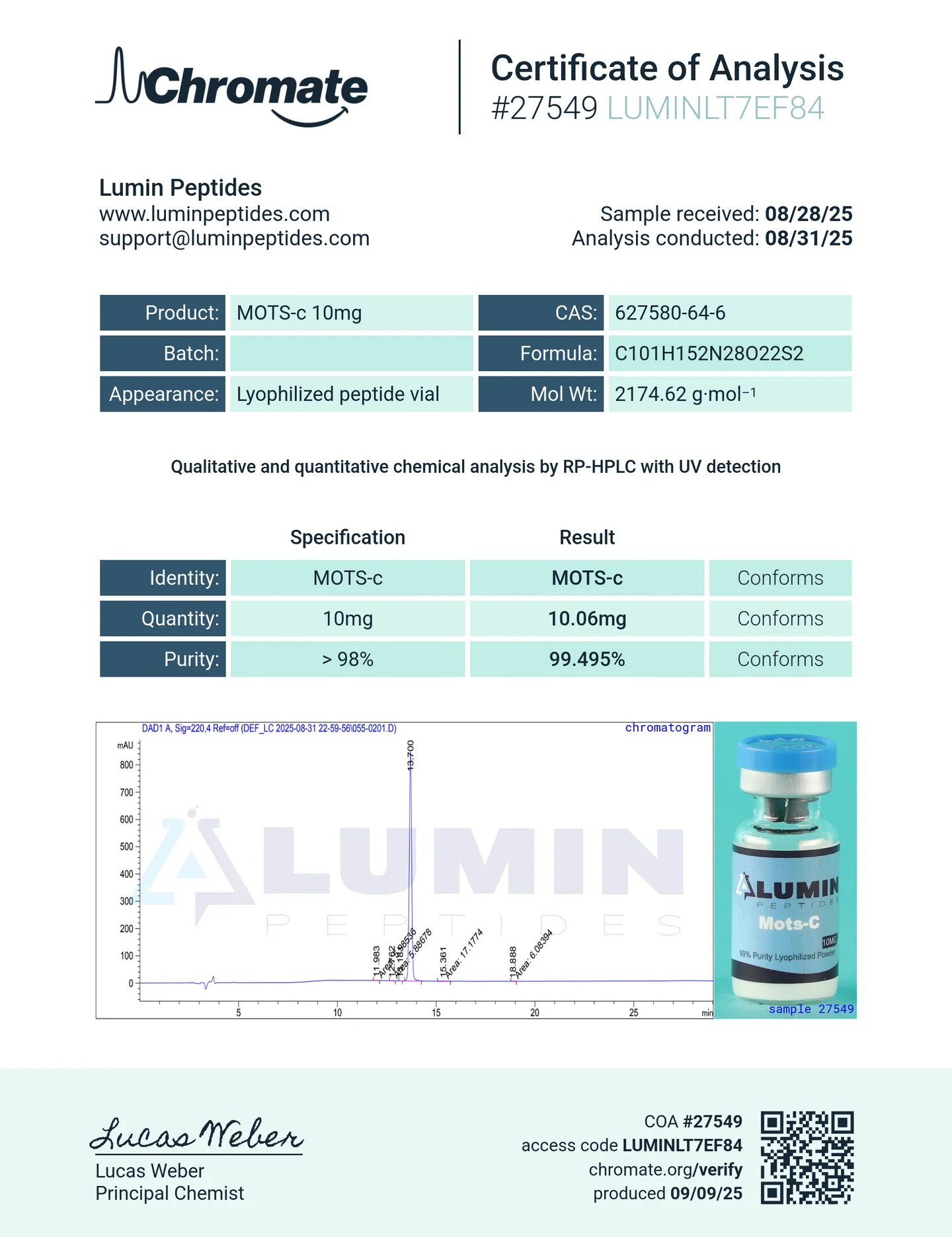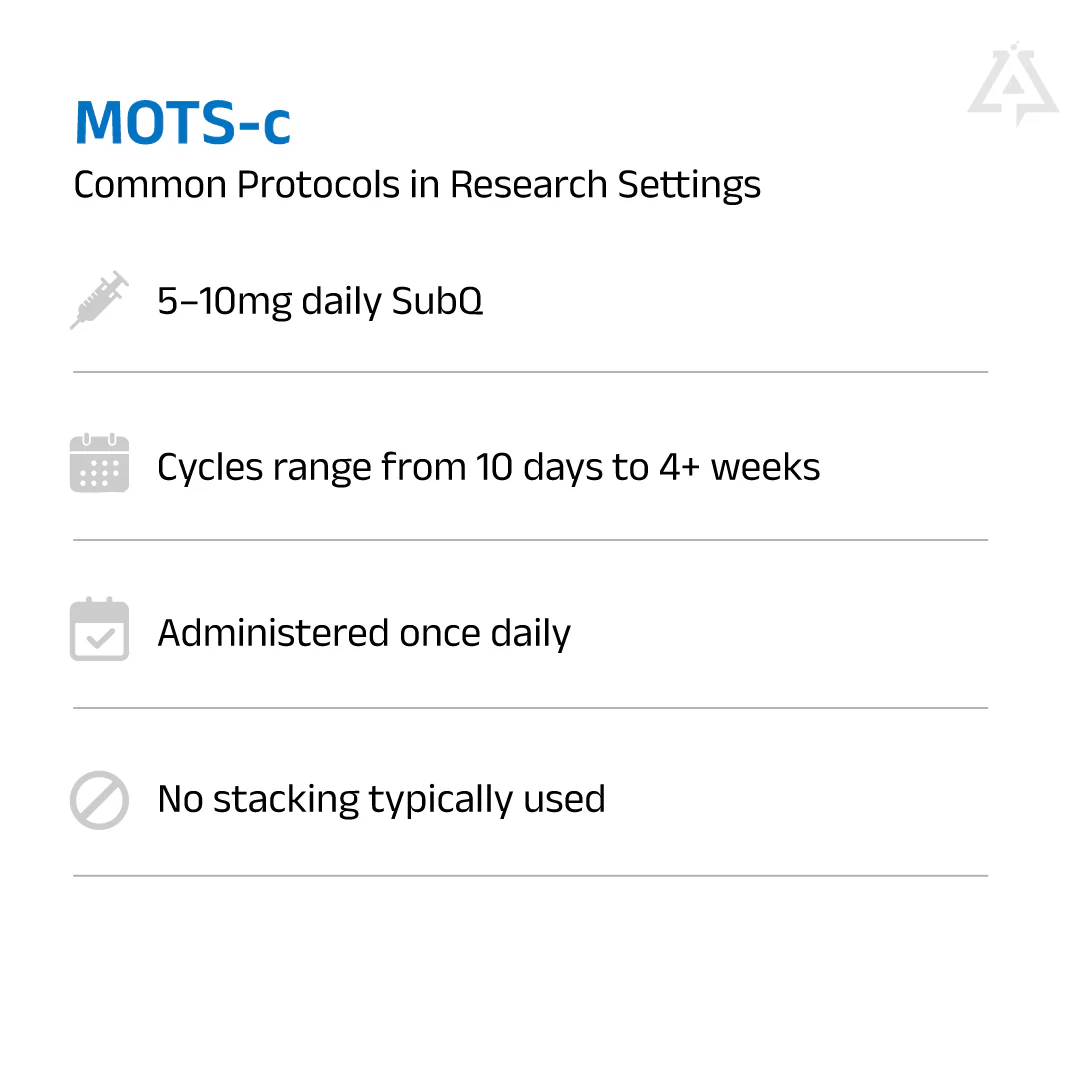 MOTS-c is a mitochondrial-derived peptide (MDP) composed of 16 amino acids, which plays a critical role in cellular metabolic regulation. Synthesized within mitochondria, MOTS-c functions by modulating the cellular energy balance through pathways involved in glucose metabolism, insulin sensitivity, and cellular stress response. MOTS-c exerts its effects by translocating to the nucleus, where it influences the expression of genes related to mitochondrial biogenesis and metabolic regulation, particularly under conditions of metabolic stress. Research has shown this peptide to improve exercise capacity, reduce obesity, insulin resistance and other disease processes such as osteoporosis and the mitigation of metabolic disorders and age-associated diseases.