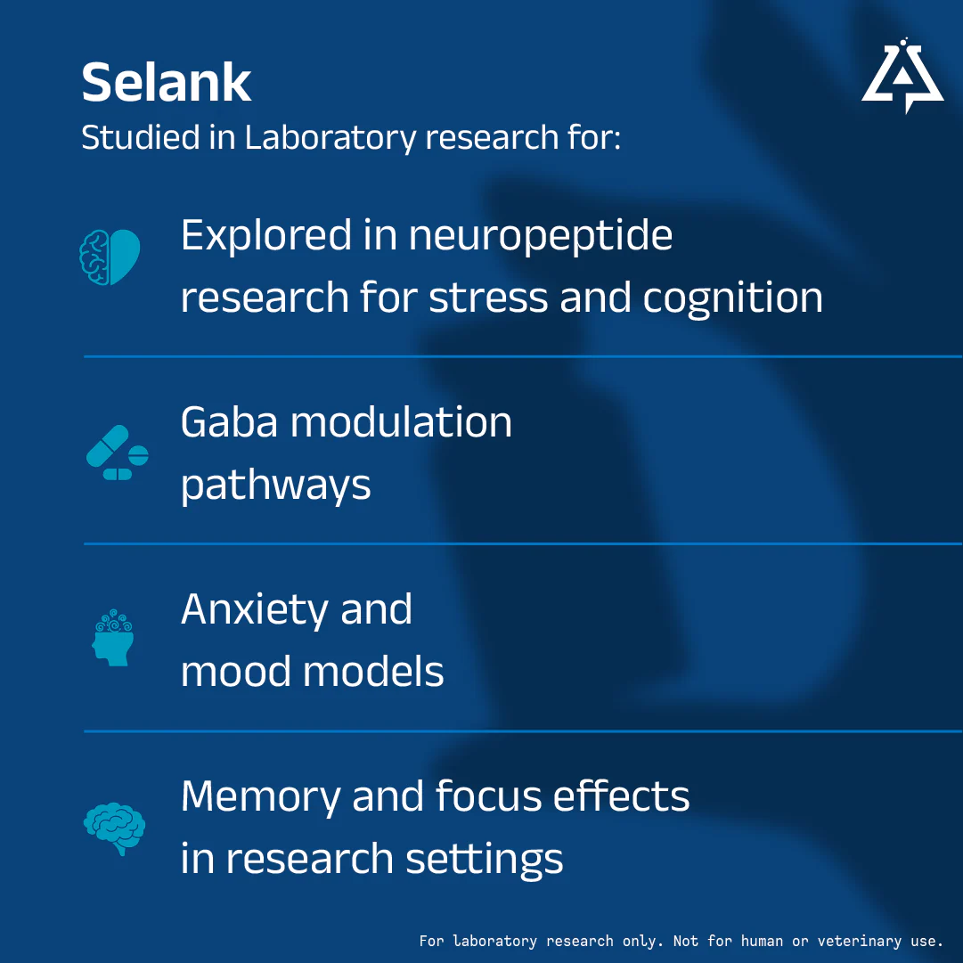 Selank peptide is a short, synthetic analogue of tuftsin. It has profound anti-anxiety properties. Selank also boosts memory and learning and has been shown to have beneficial effects on pain perception.