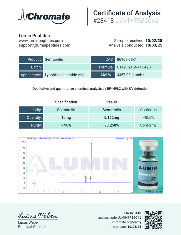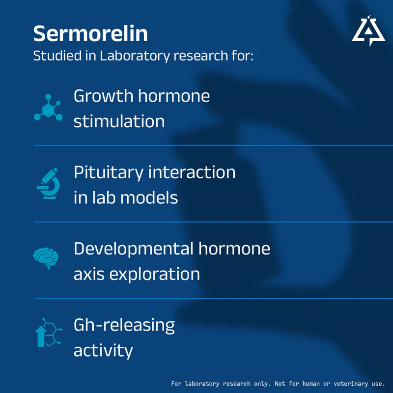 Sermorelin is a growth-hormone-releasing hormone (GHRH) analogue used clinically to assess and improve natural growth hormone secretion. It is of interest to researchers for its ability to improve bone density, reduce scaring, fight the effects of dementia, and reduce seizure activity.