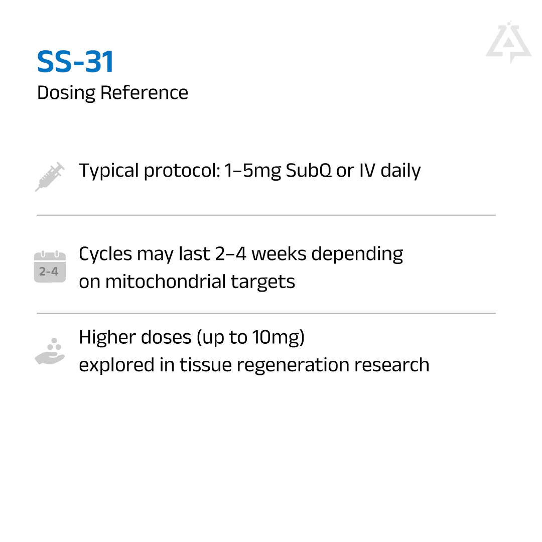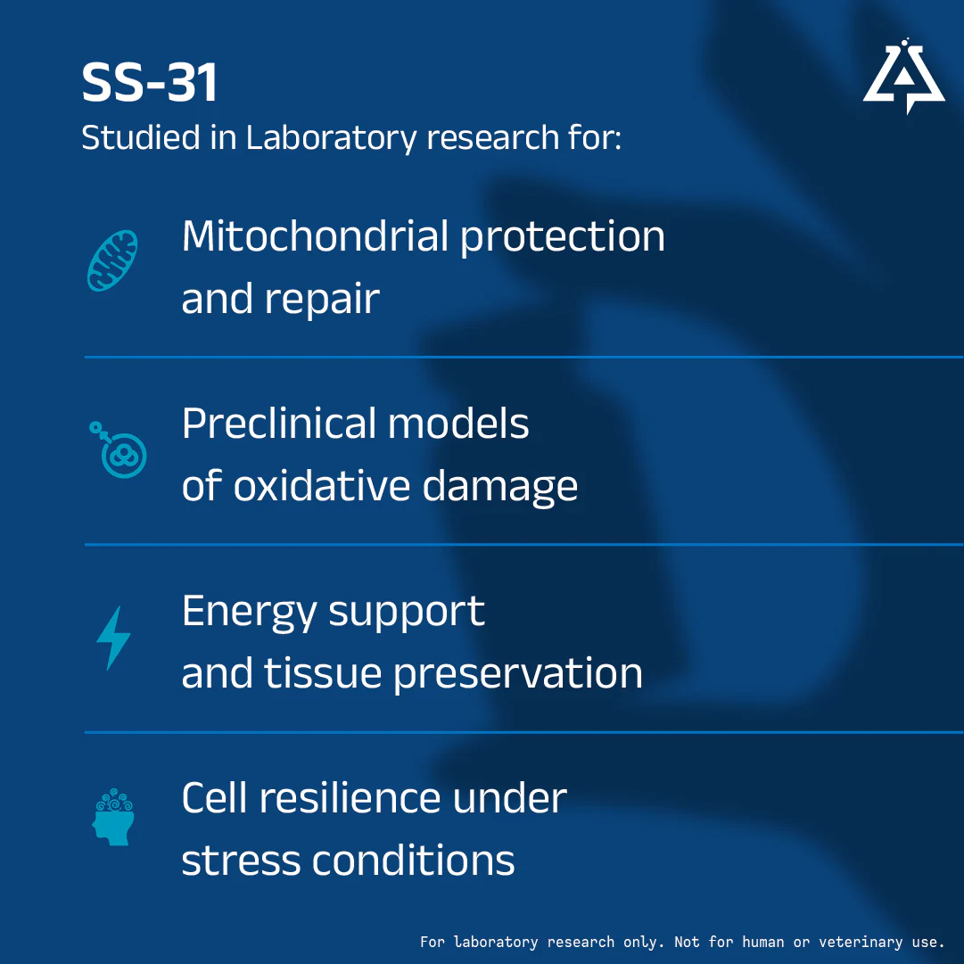 SS-31 (elamipretide) is a small, aromatic peptide that easily penetrates cell and organelle membranes. It is thought to interfere with the production of reactive oxygen species (ROS or free radicals) and promote energy production in cells by stabilizing the enzyme cardiolipin within mitochondria. Cardiolipin is part of the inner mitochondrial membrane where it acts as a fundamental component of the electron transport chain, the machinery by which most energy need for cellular functioning is produced.
