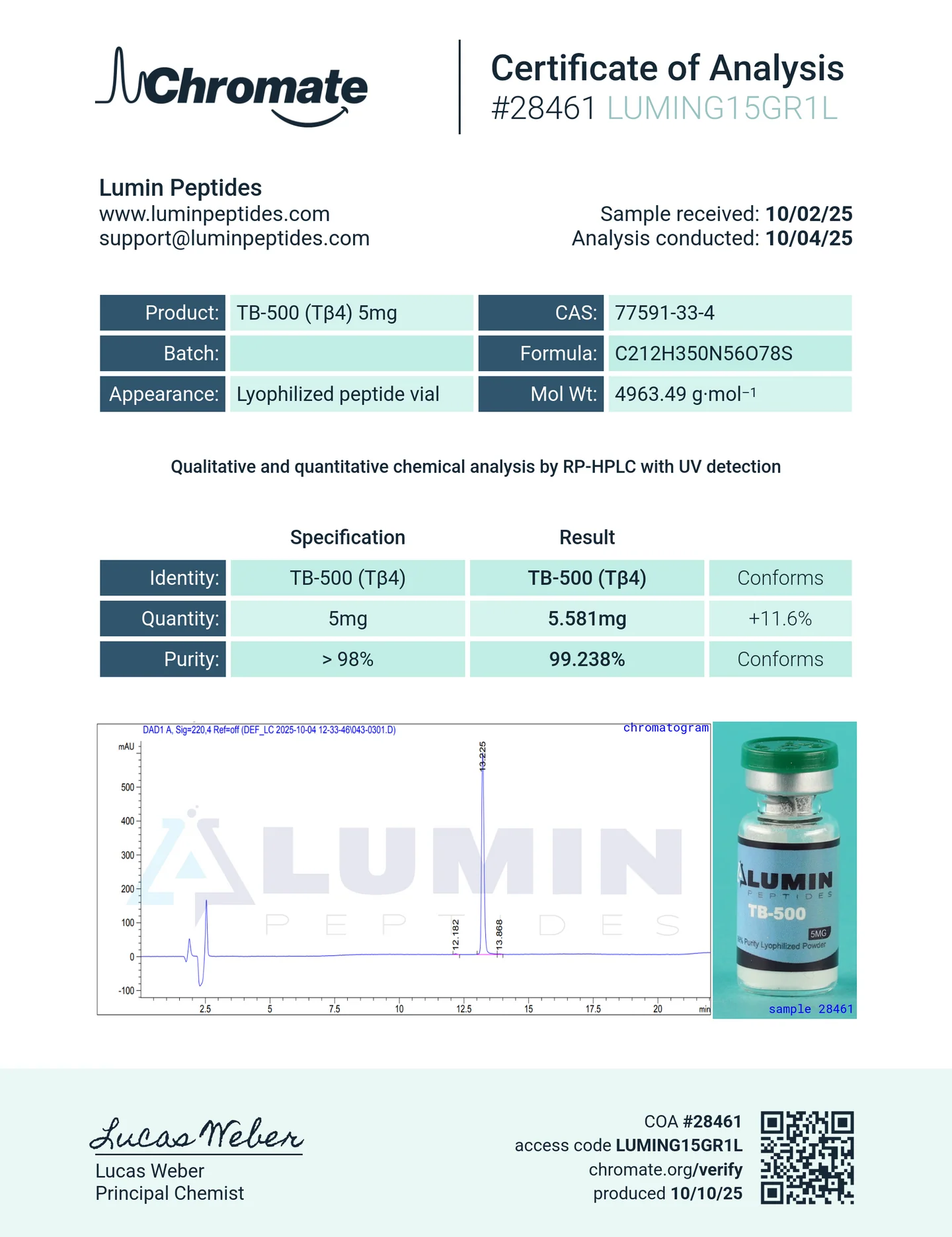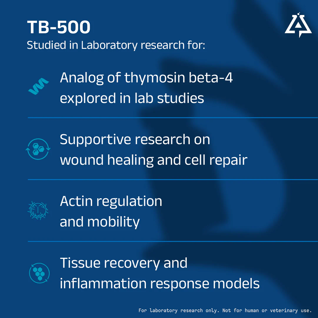 TB-500 is a 43 amino acid peptide sequence. In animal models, Thymosin Beta-4 has been shown to improve blood vessel growth, regulate wound healing, decrease inflammation, and reduce oxidative damage in the heart and central nervous system. Thymosin-beta-4 has a role in protection, tissue repair, regeneration and remodeling of injured or damaged tissues. It is also of active interest in anti-aging research.