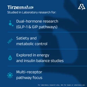 Tirze is studied as a dual GIP and GLP-1 receptor agonist, often in the context of insulin sensitivity, weight regulation, and metabolic signaling.